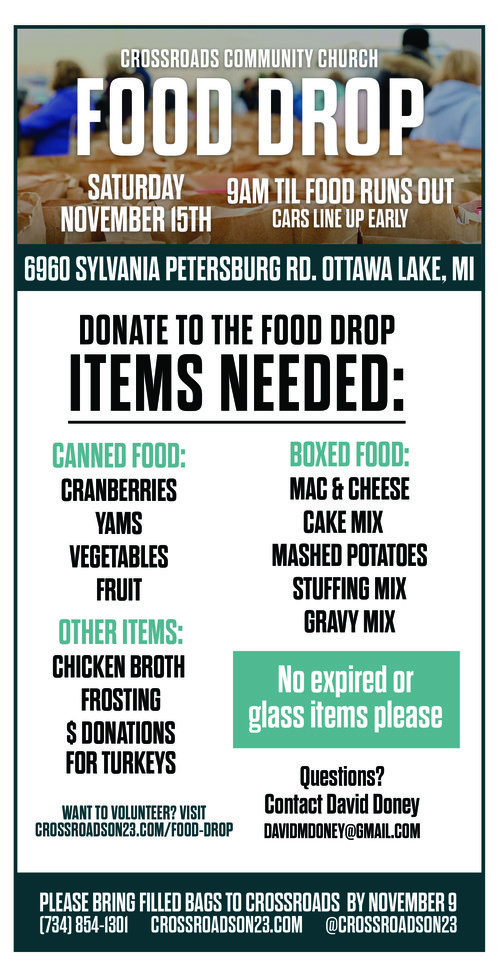 1. Food Drop bags will be available for pickup starting October 26th! Fill up with groceries following the directions on the tag and bring back to Crossroads by November 9th (or you can use your own bag, instructions and food list below!)