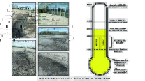 We're kicking off an initiative to address critical sidewalk and parking lot repairs at Crossroads. With $135,000 already saved, and a generous $75,000 matching gift secured, every donation counts toward our goal. Give above and beyond your tithe, including stocks if preferred, and consider pledging your support to help us determine the scope of this project. We can't wait to ensure a safer space for events, services, and more!