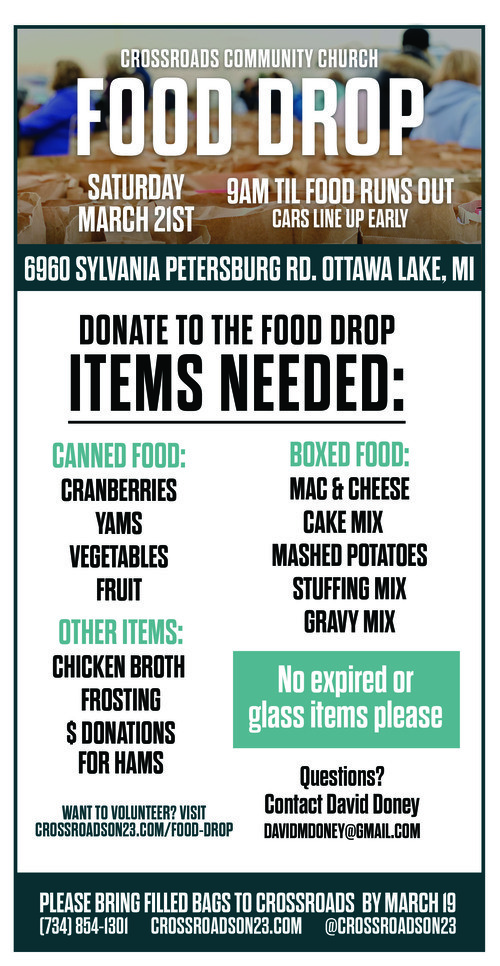 1. Food Drop bags will be available for pickup starting February 15th! Fill up with groceries following the directions on the tag and bring back to Crossroads by March 19th (or you can use your own bag, instructions and food list below!)